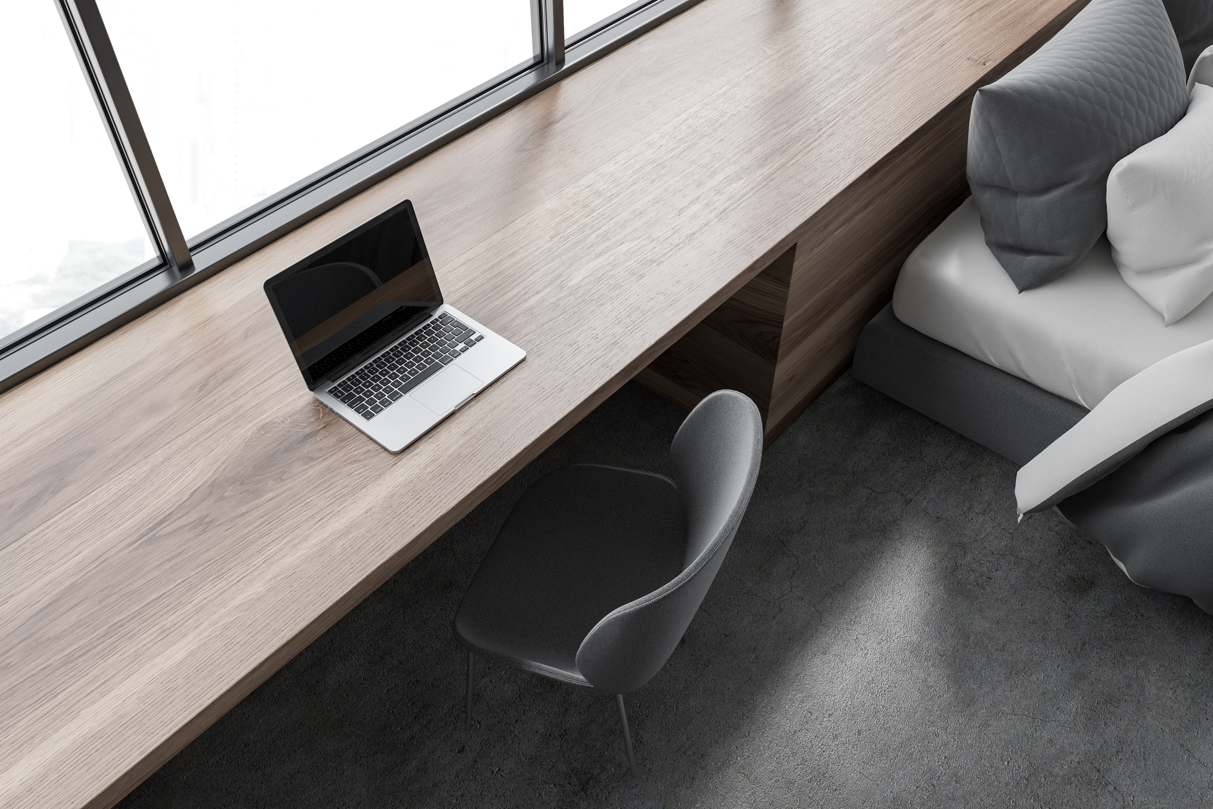 Top view of home office in modern bedroom with concrete floor, wooden desk with laptop on it and comfortable bed beside it. Concept of freelance job. 3d rendering