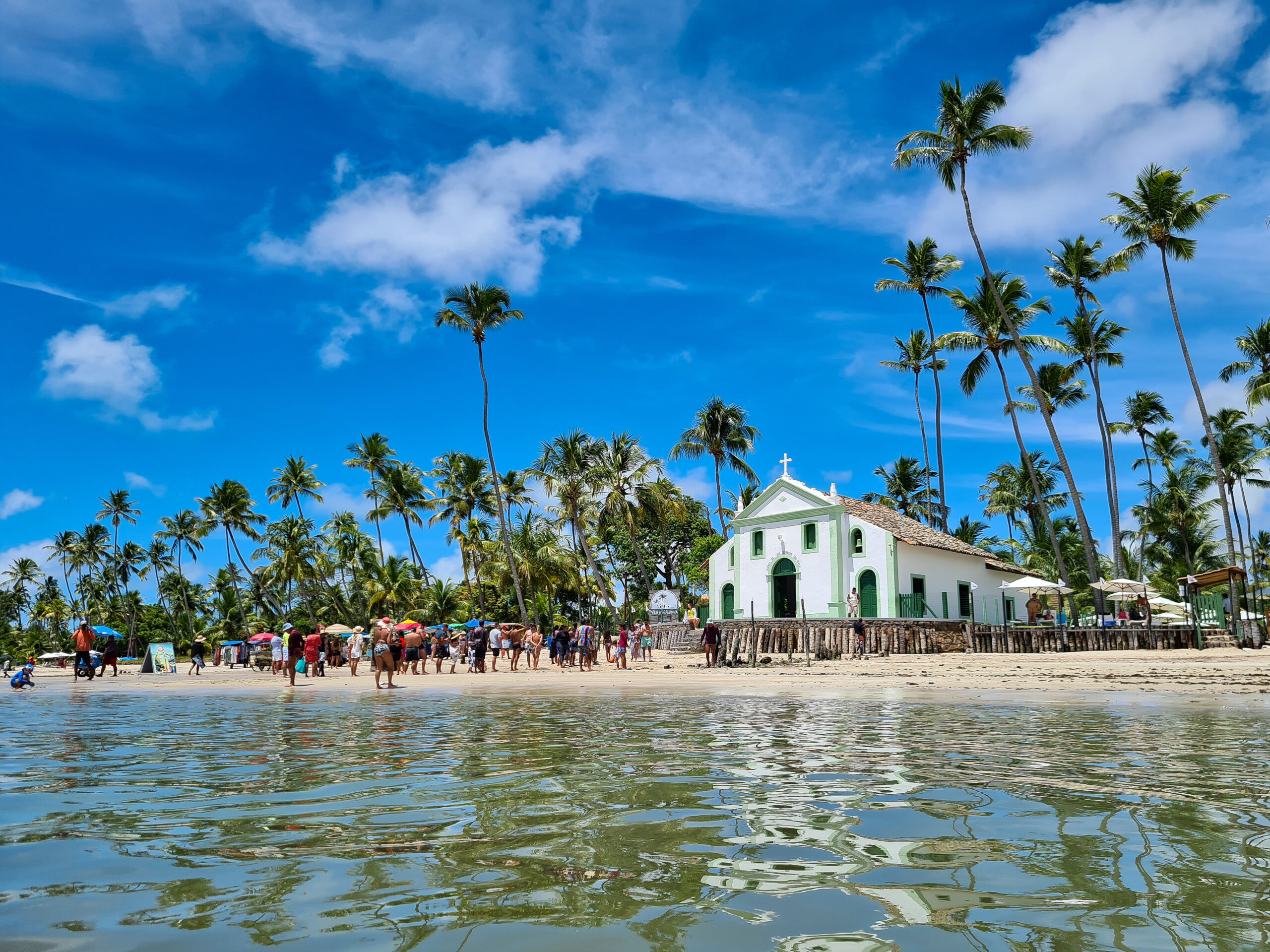 Tourists on a beach lined with coconut trees and a century-old church, seen from the water.