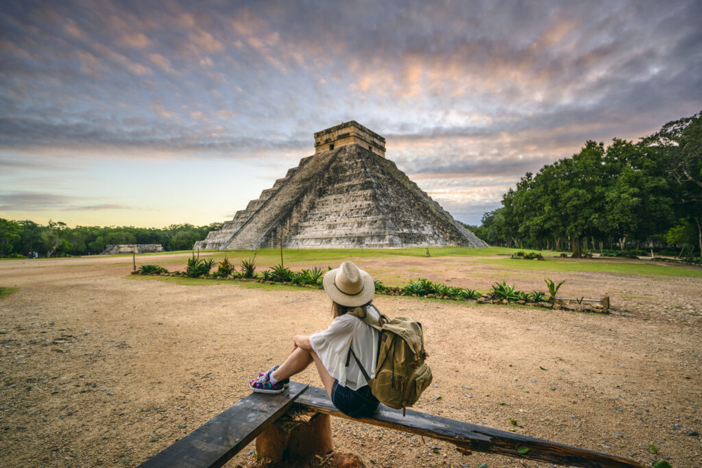 One woman admiring Kukulkan pyramid at Chichen-Itza archaeological site, Yucatan, Mexico