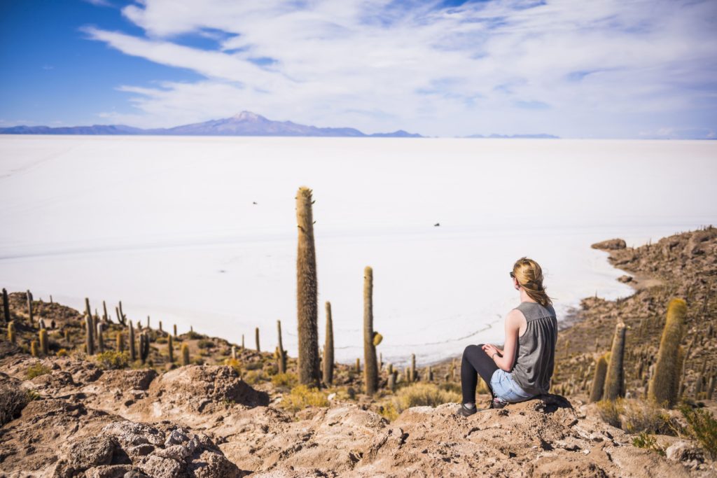 Tourist on cactus covered Fish Island, Isla Incahuasi or Inka Wasi, Uyuni Salt Flats, Salar de Uyuni, Uyuni, Bolivia, South America ID: 30687