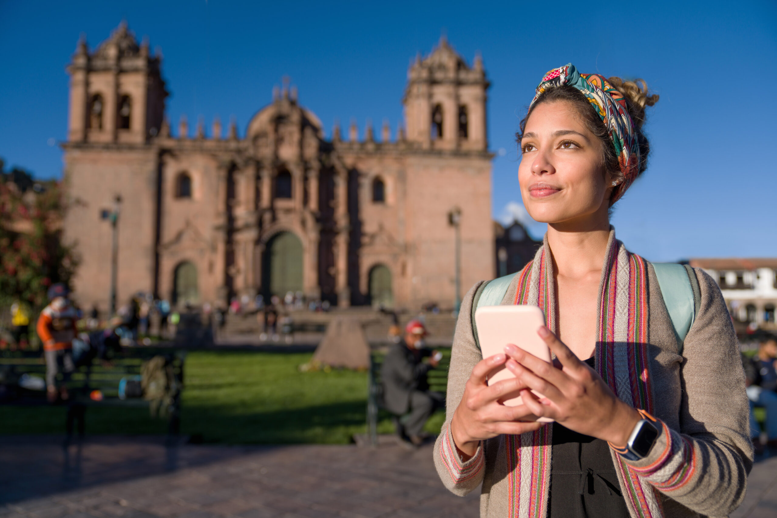 Portrait of a female tourist sightseeing around Cusco while texting on her cell phone – travel concepts