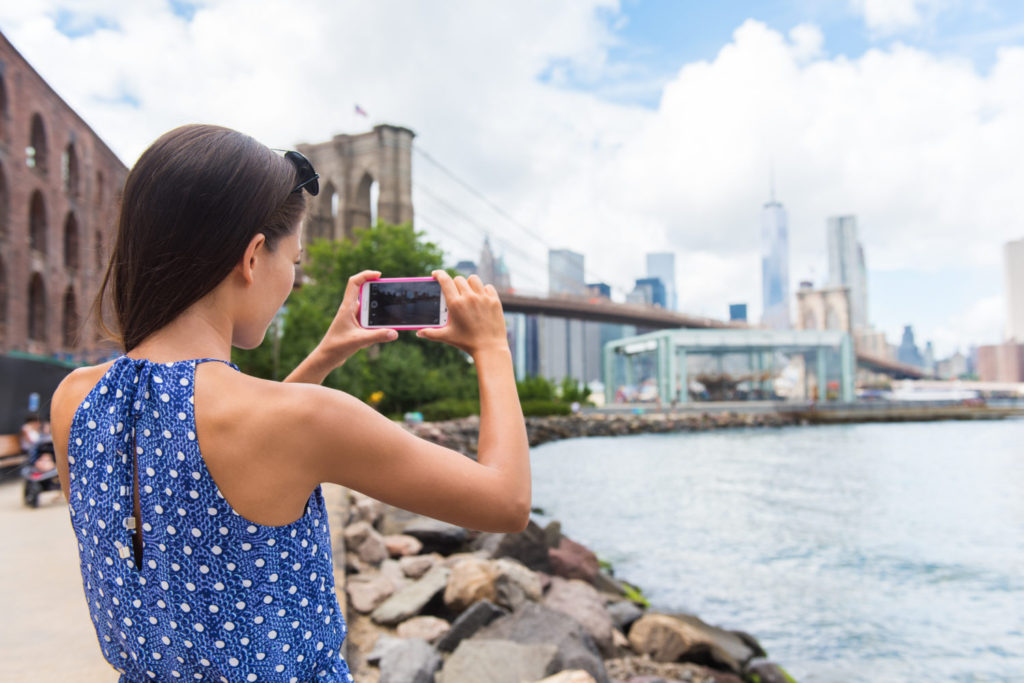 tourist taking travel picture with phone of brooklyn bridge and