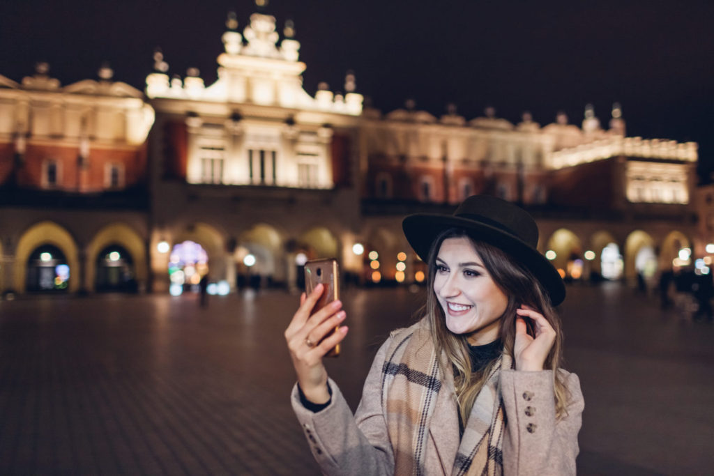 Tourist woman taking selfie on smartphone at night on Market square in Krakow Poland. Travel around Europe