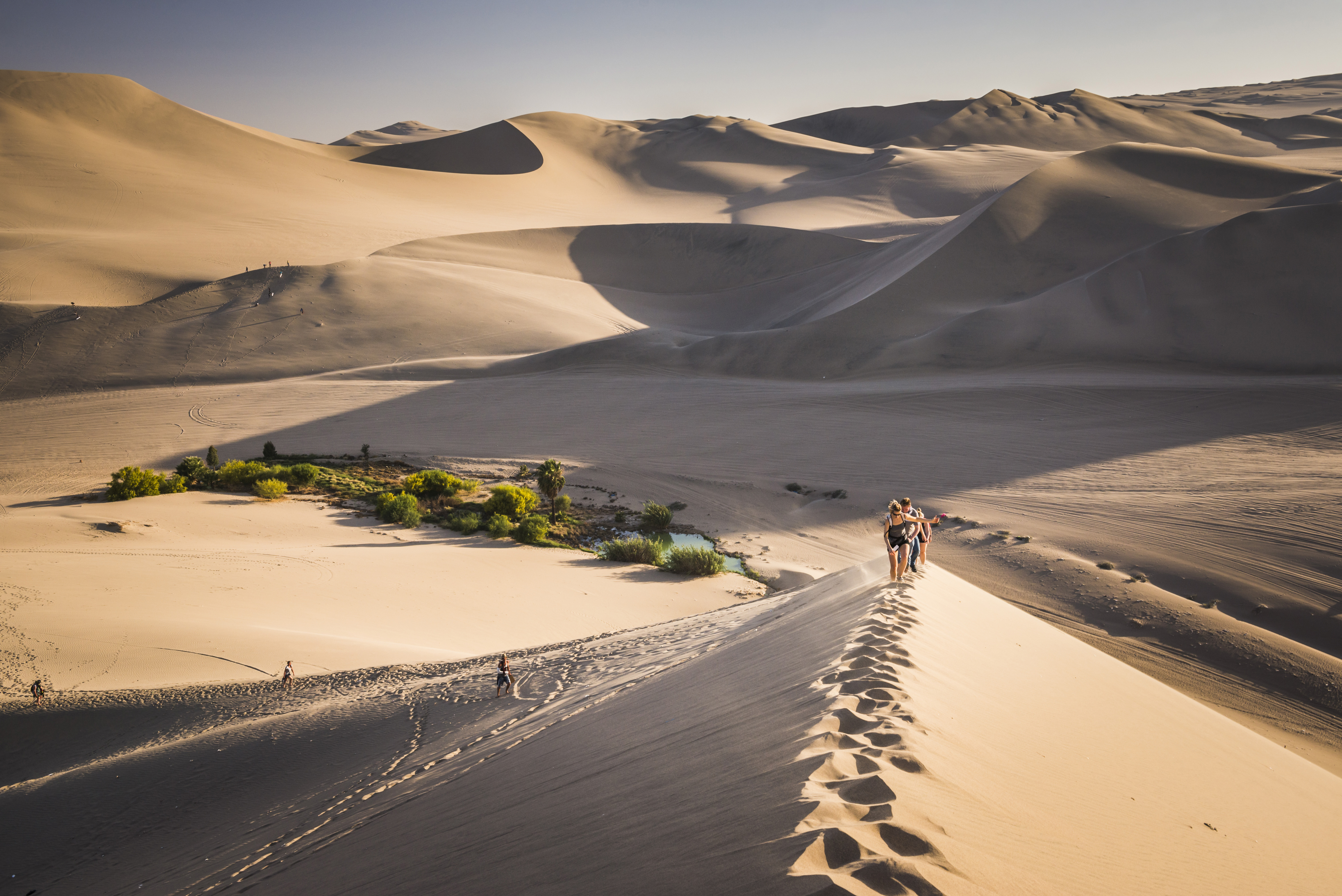 Tourists climbing sand dunes at sunset at Huacachina, a village in the desert, Ica Region, Peru ID: 22768