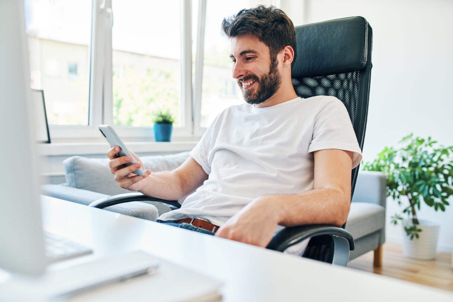 Trabajador independiente que usa smartphone en la oficina del hogar