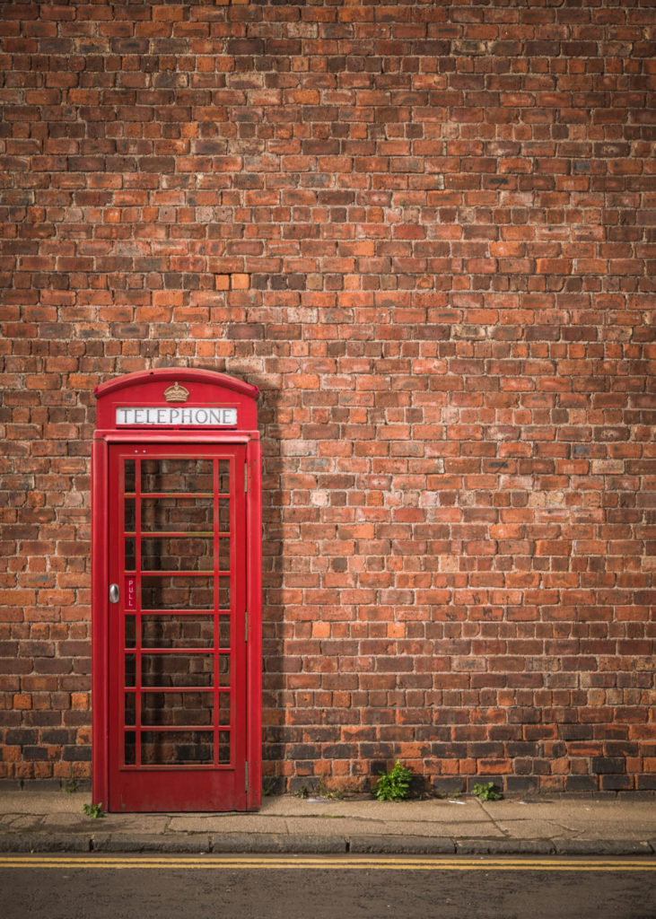Traditional Red British Telephone Box Against A Red Brick Wall With Copy Space