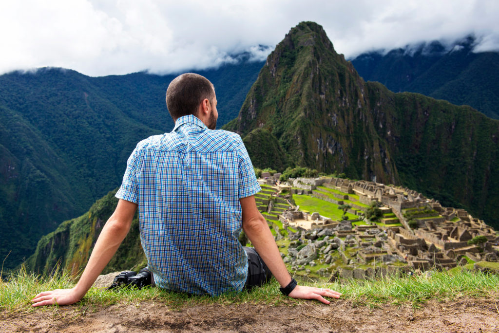 Traveler looking at Machu Picchu citadel and Huayna mountain, Peru