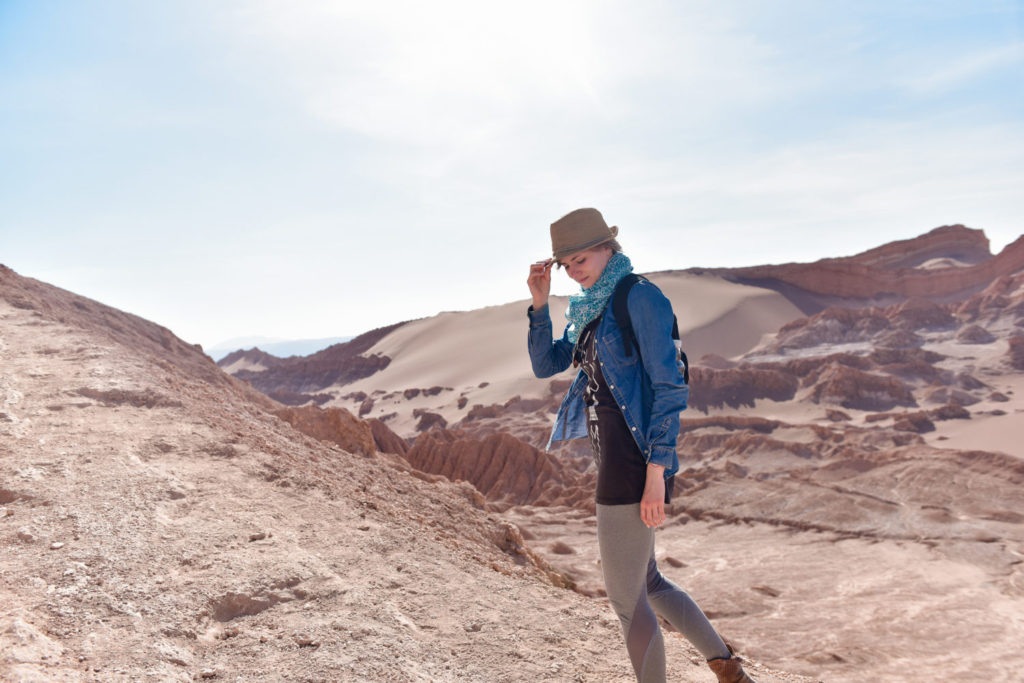 traveling woman in hat valley of the moon atacama desert