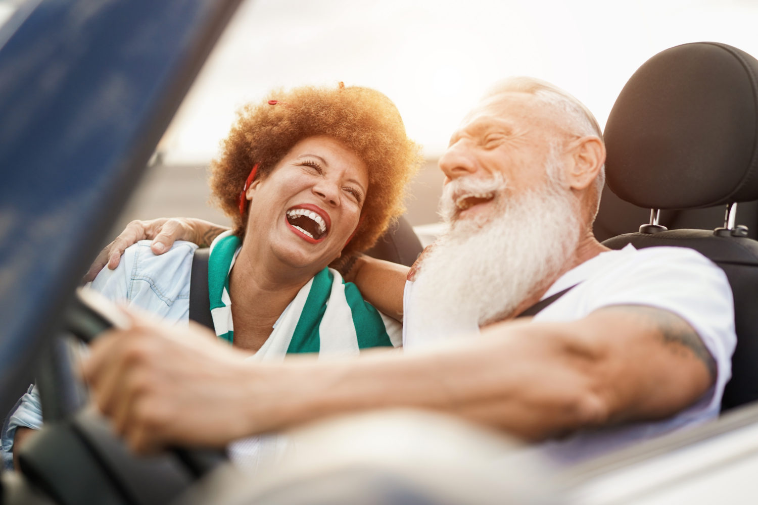 Trendy senior couple having fun inside convertible car – Multiracial mature people on a road trip in summer vacation with cabriolet car