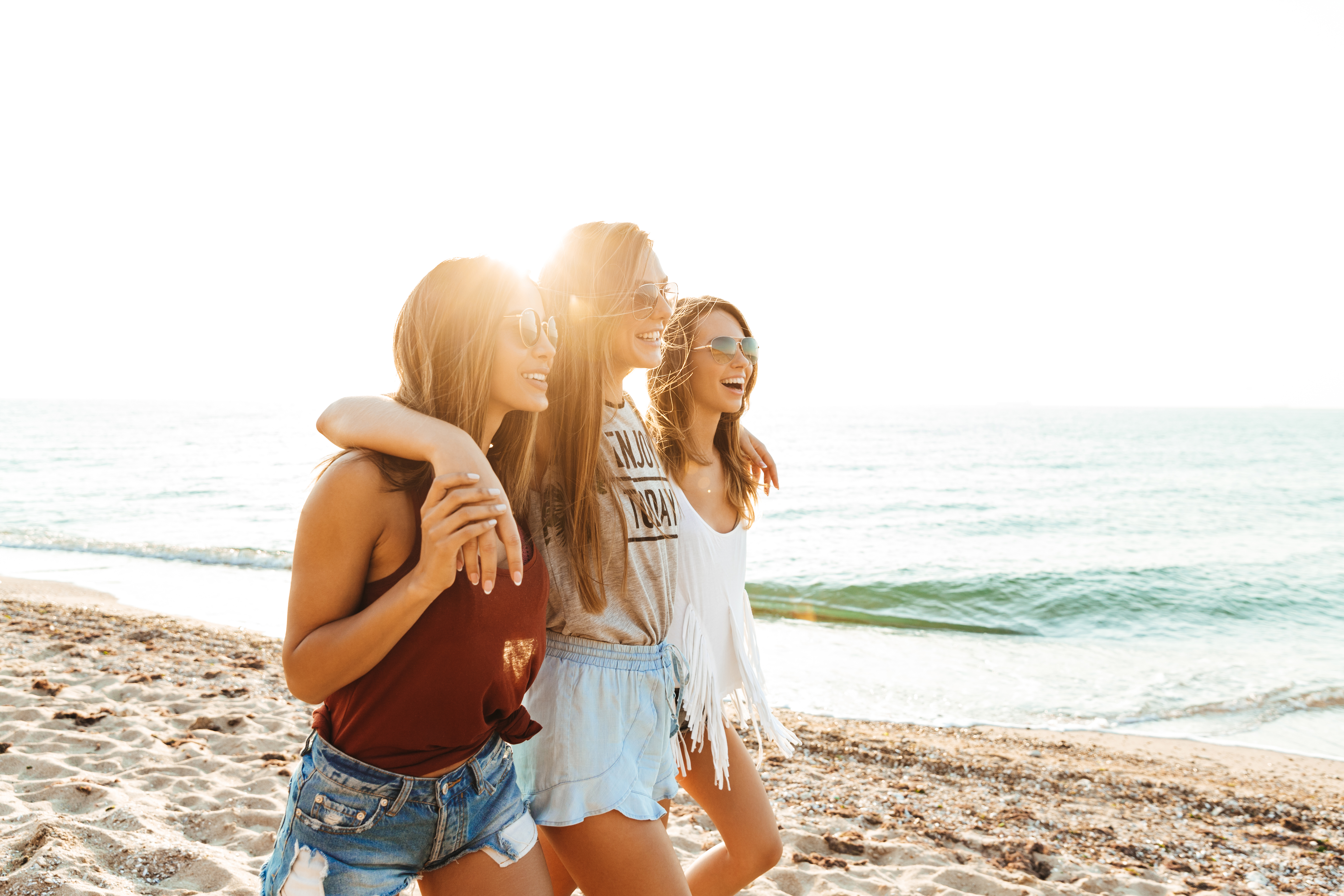 tres jovencitas alegres caminando por la playa divirtiendose riendo abrazandose