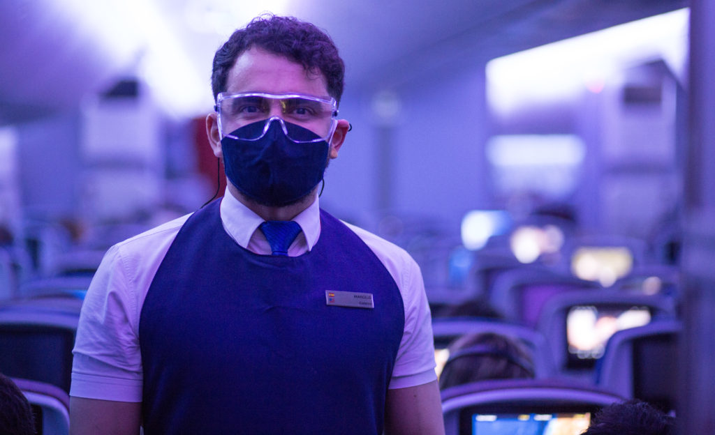 Tripulación servicio a bordo hombre con mascarilla