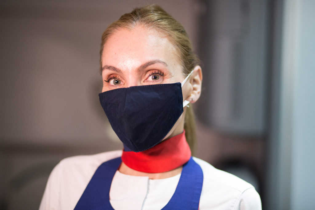 Tripulación servicio a bordo mujer con mascarilla