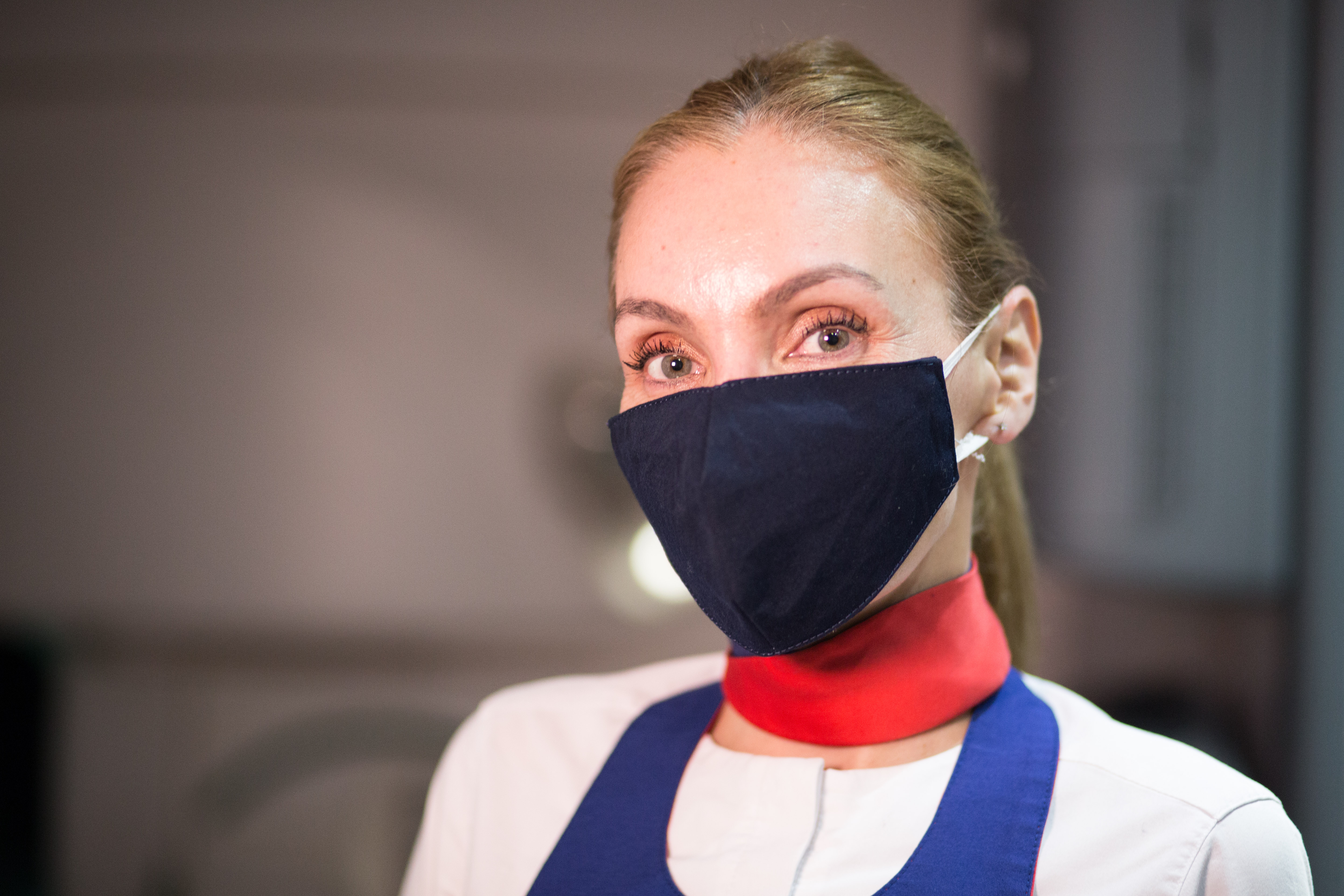 Tripulación servicio a bordo mujer con mascarilla