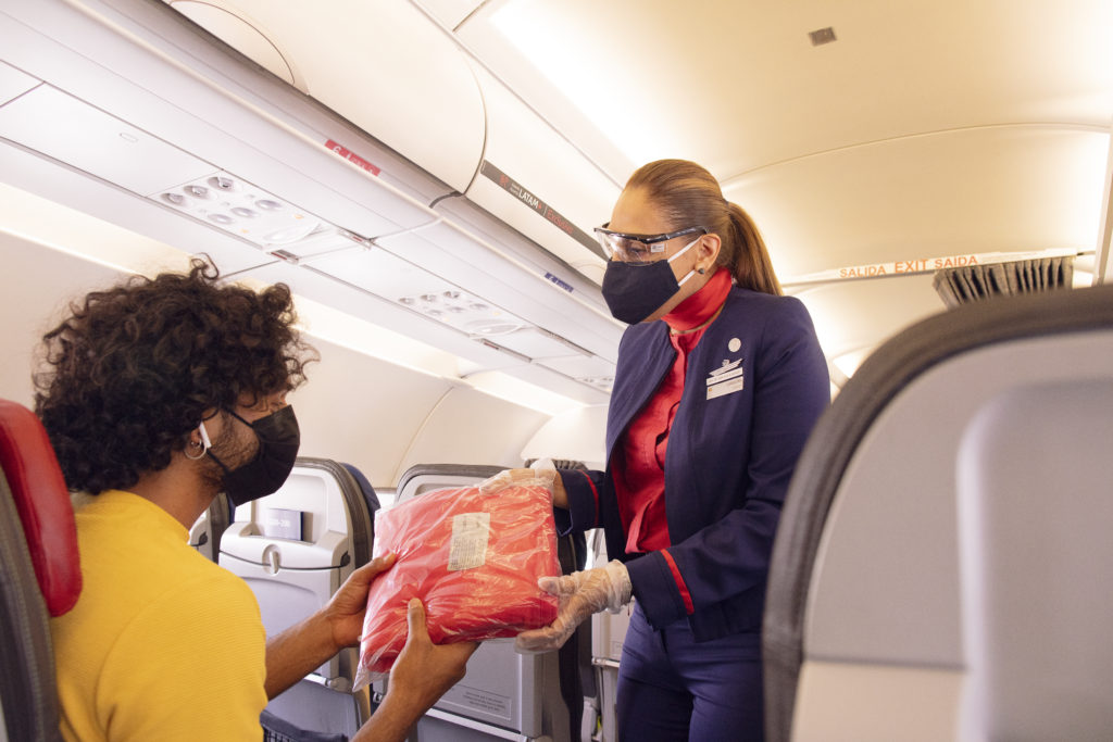Tripulante de cabina entregando cobijas