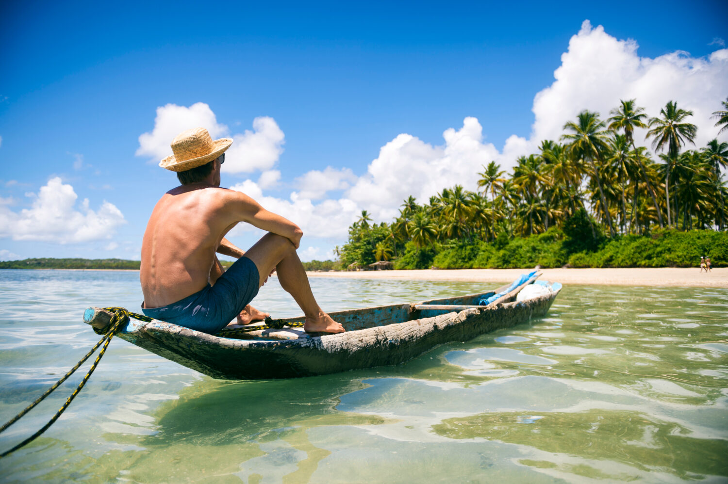 Turista con un sombrero de paja sentado en una rústica canoa de gota en una soleada playa tropical bordeada de palmeras en Bahía, Brasil