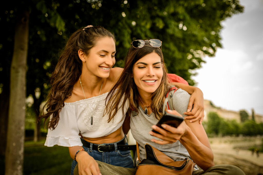 Two friends using mobile phone.