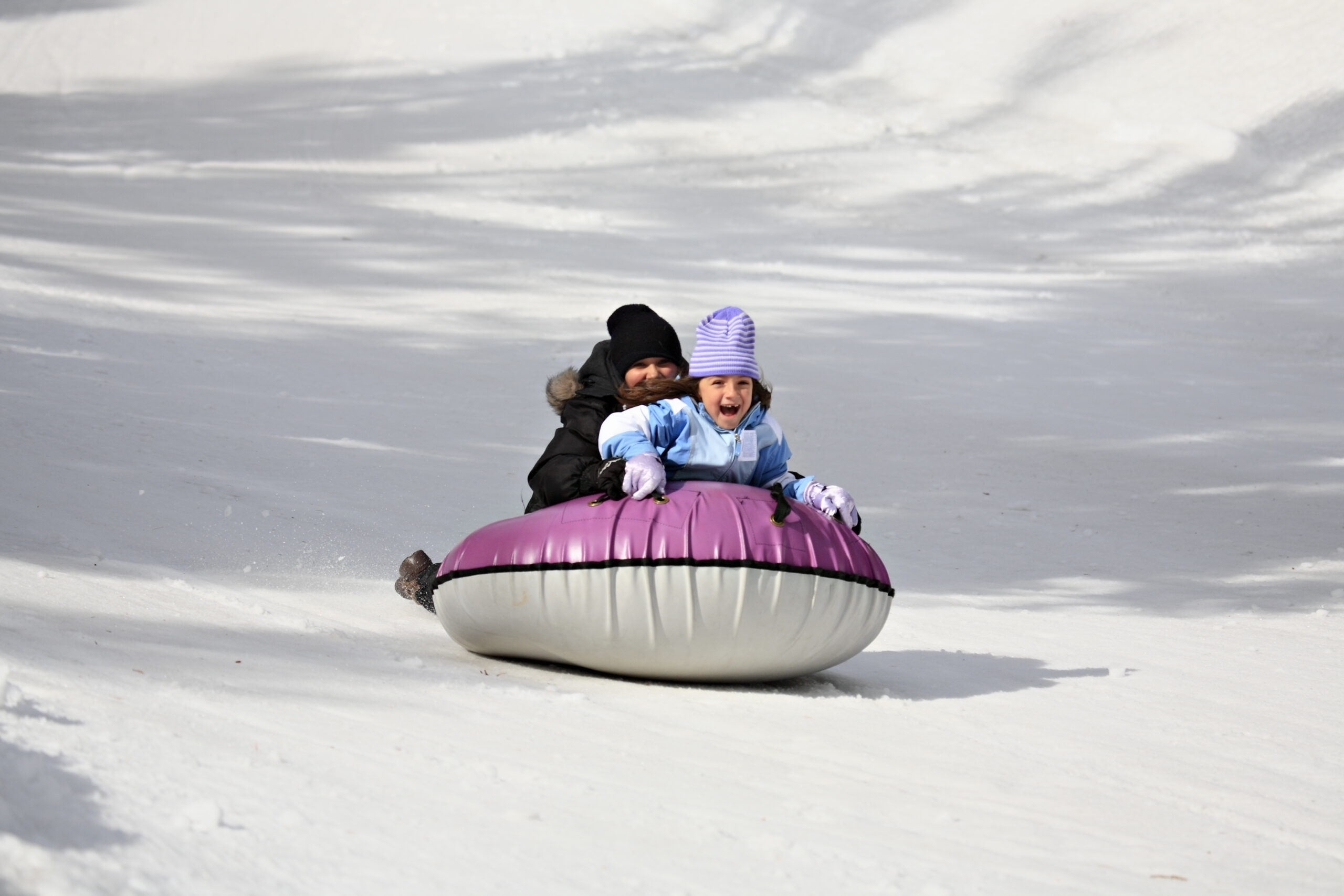 Two sisters are on the move in this inner tube as they fly down the snowy hill, laughing and smiling and screaming all the way.