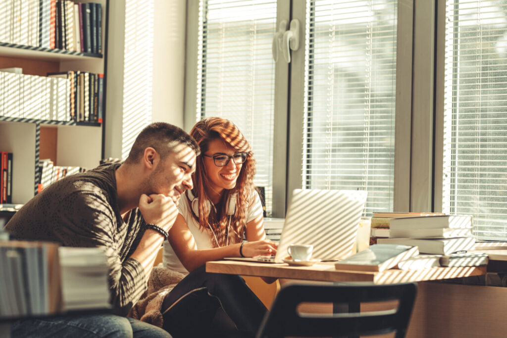 Two students study in the school library.Learning and preparing for university exam.Using laptop and learning online.