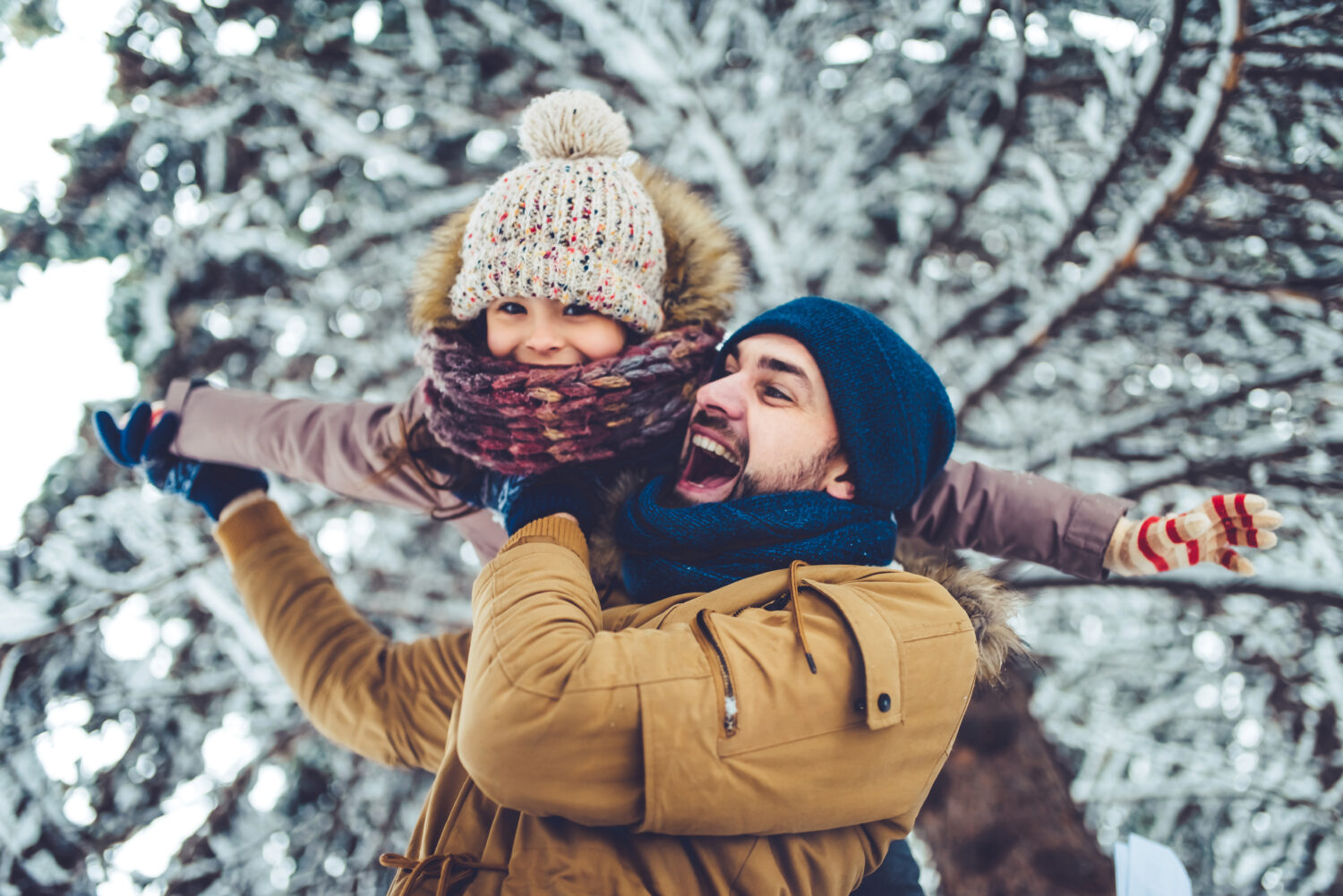 Un buen padre joven y su linda hija se están divirtiendo al aire libre en invierno. Disfrutando de pasar tiempo juntos. Concepto familiar.