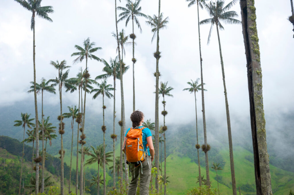 Un excursionista entre las palmas de cera que son las más altas del mundo en el valle de Cocora en Colombia