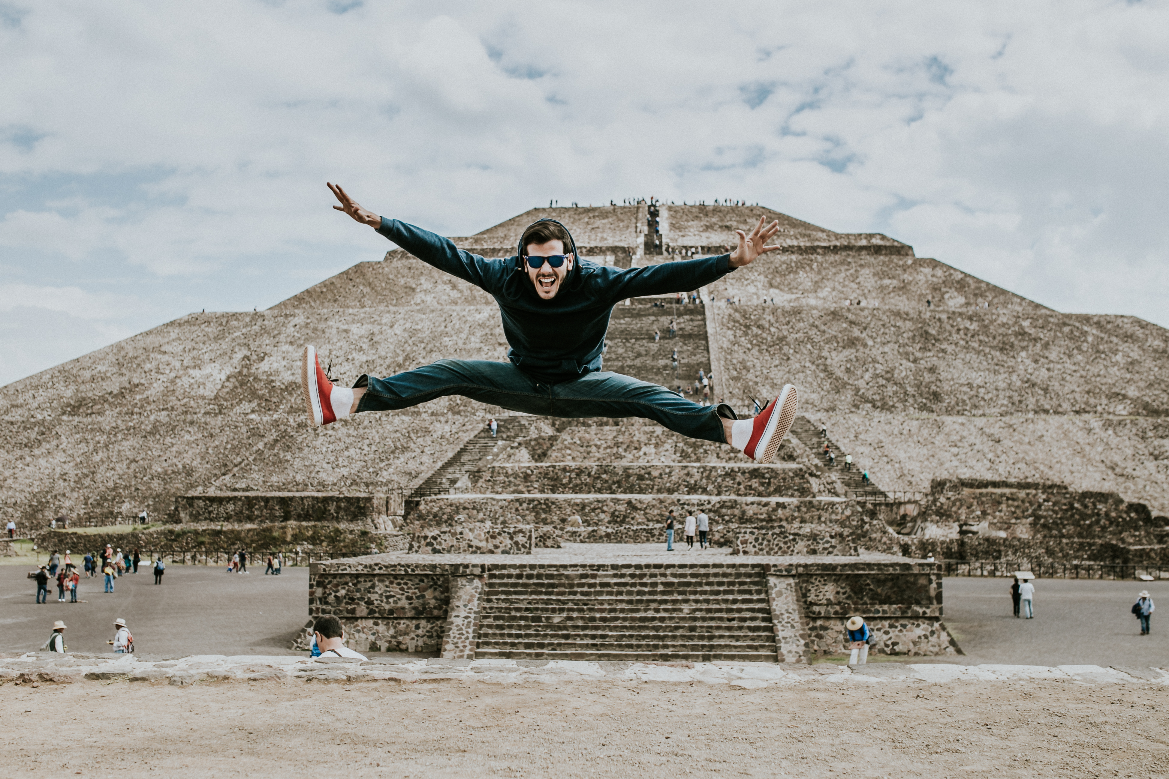 Un joven turista despreocupado disfruta de las pirámides de Teotihuacán en México, saltando tan alto frente a las pirámides. Retrato de estilo de vida.