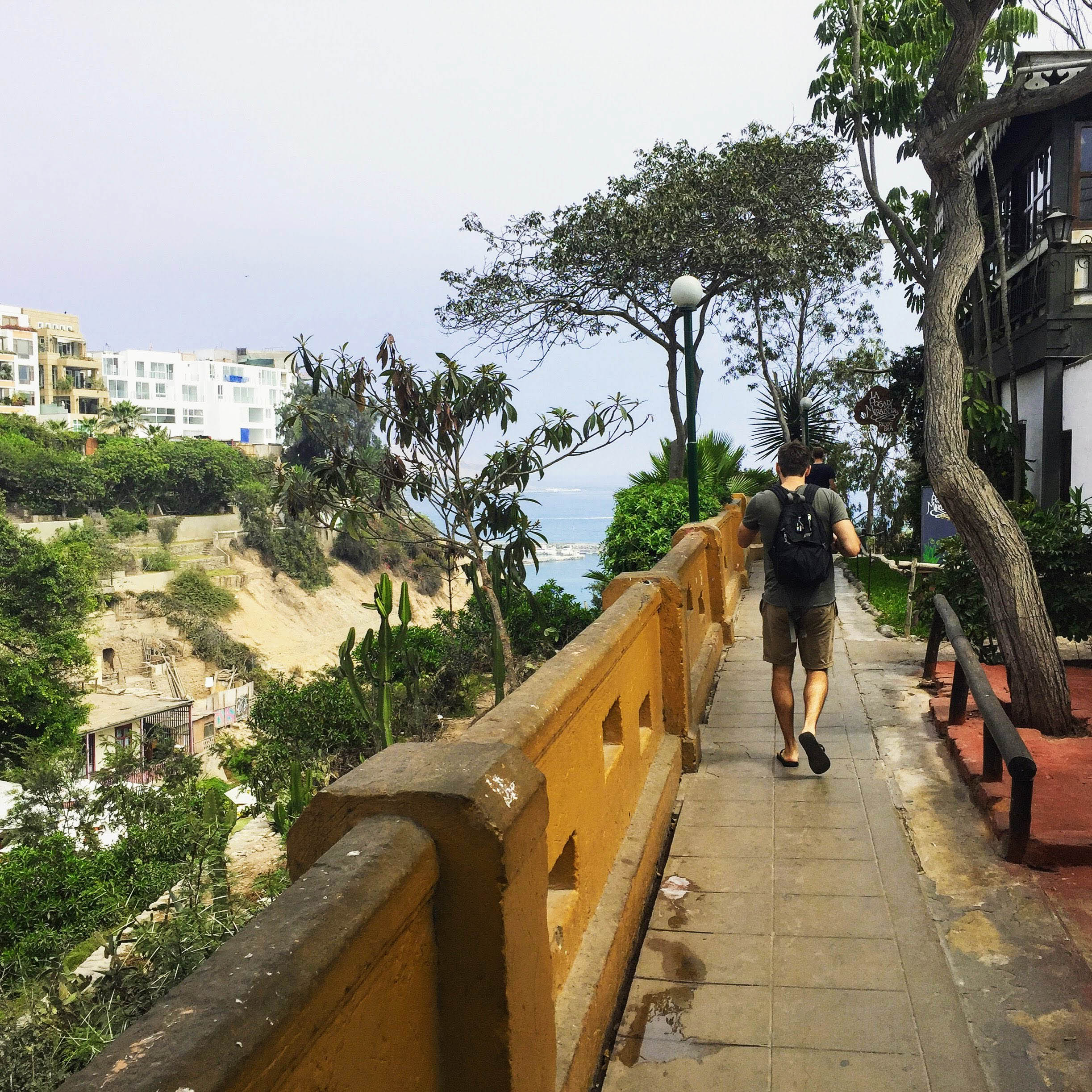 Un joven turista macho caminando por un patio con restaurantes de alta en la ladera de Lima, Perú ID: 30321