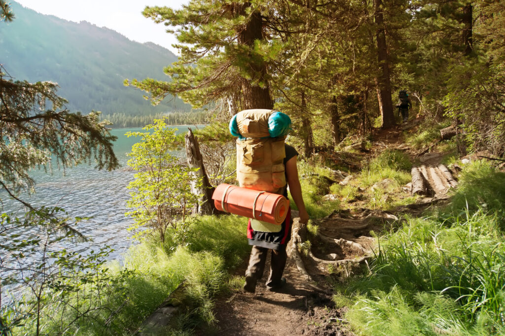 un mochilero con una mochila grande grupo de viajeros con