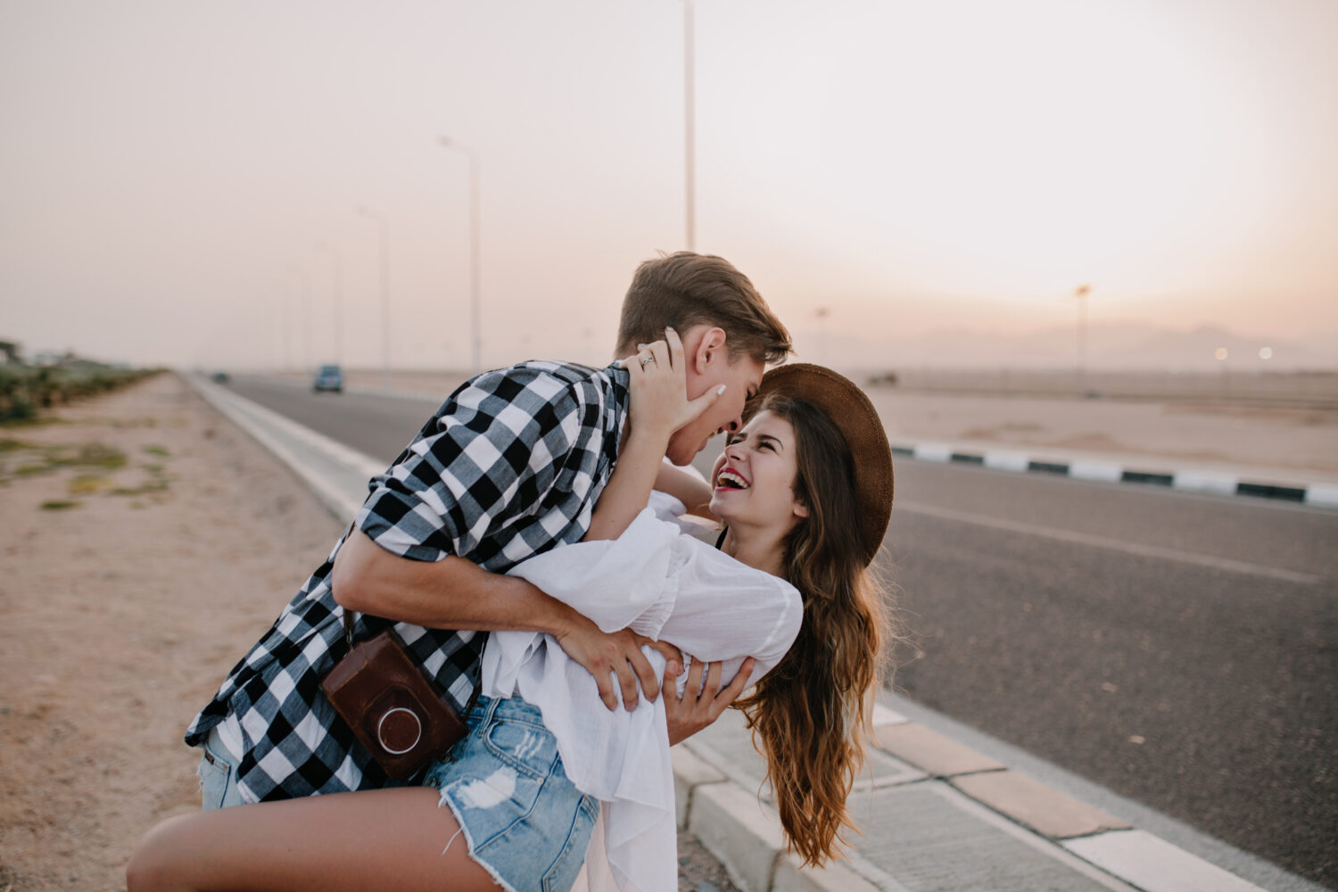 Un tipo riéndose con bailes de cámara retro con su novia de pelo largo cerca de la autopista, esperando un paseo. Hermosa pareja amorosa divirtiéndose afuera y disfrutando de la vida al atardecer, abrazándose en la carretera