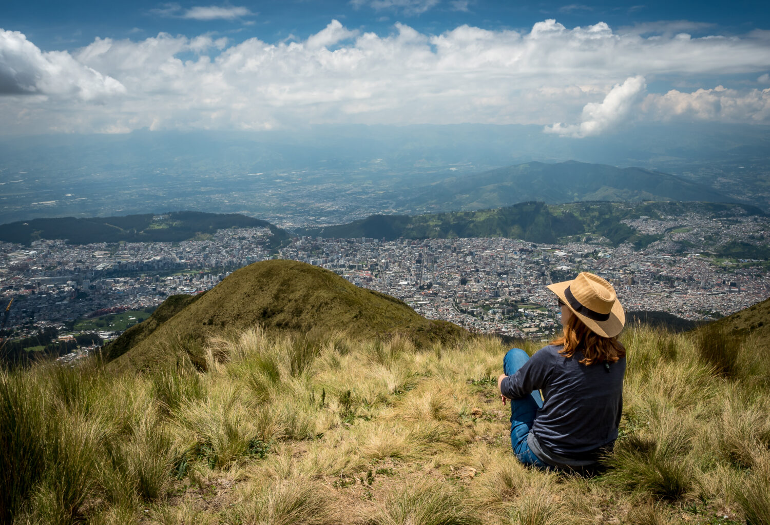 Una jengibre con sombrero de vaquero mira la vasta ciudad de Quito, Ecuador desde las altas cuestas de pastos del volcán Pichincha.