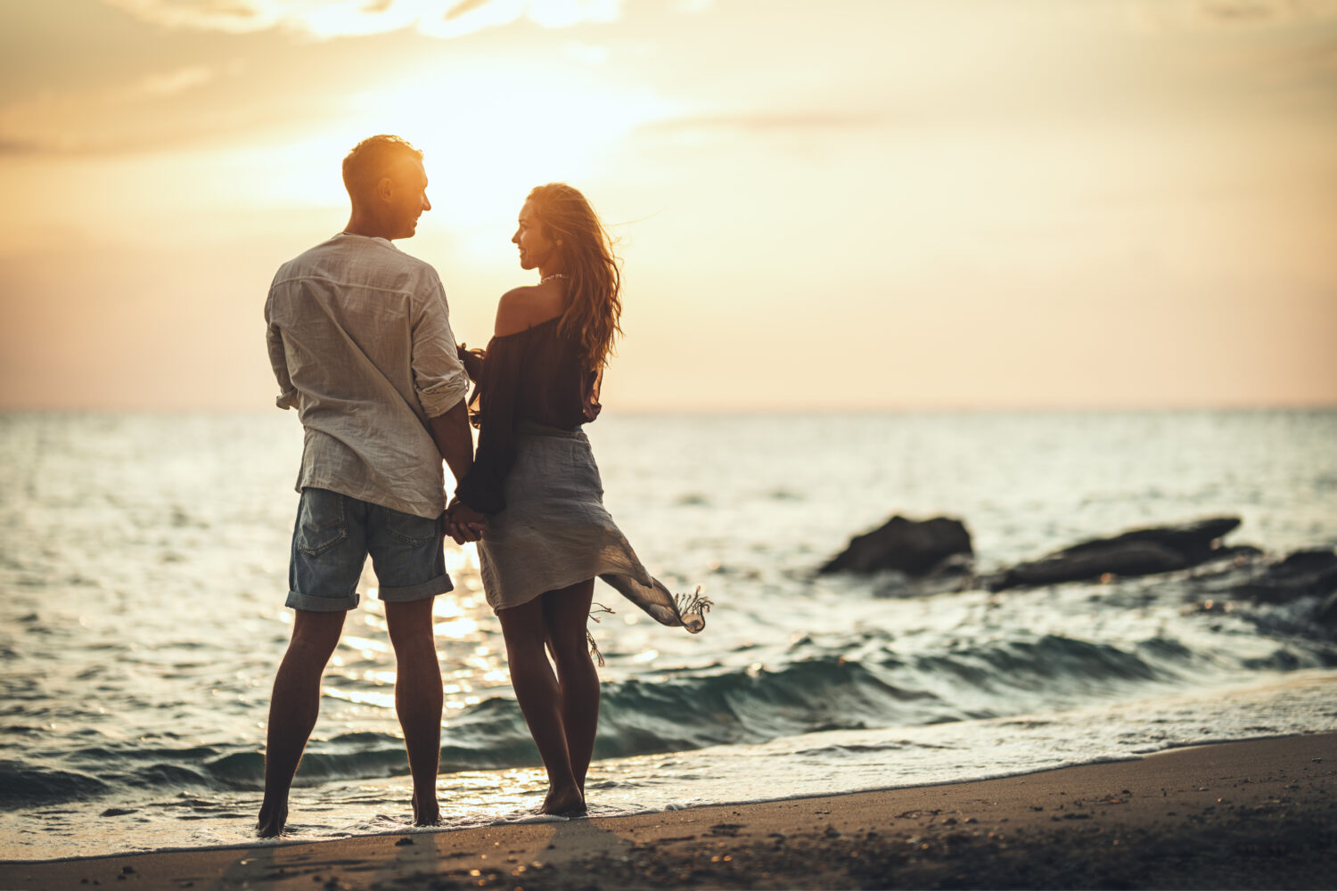Una pareja amorosa se está divirtiendo y abrazando en la playa de arena vacía al atardecer. Se miran y sonríen alegremente.