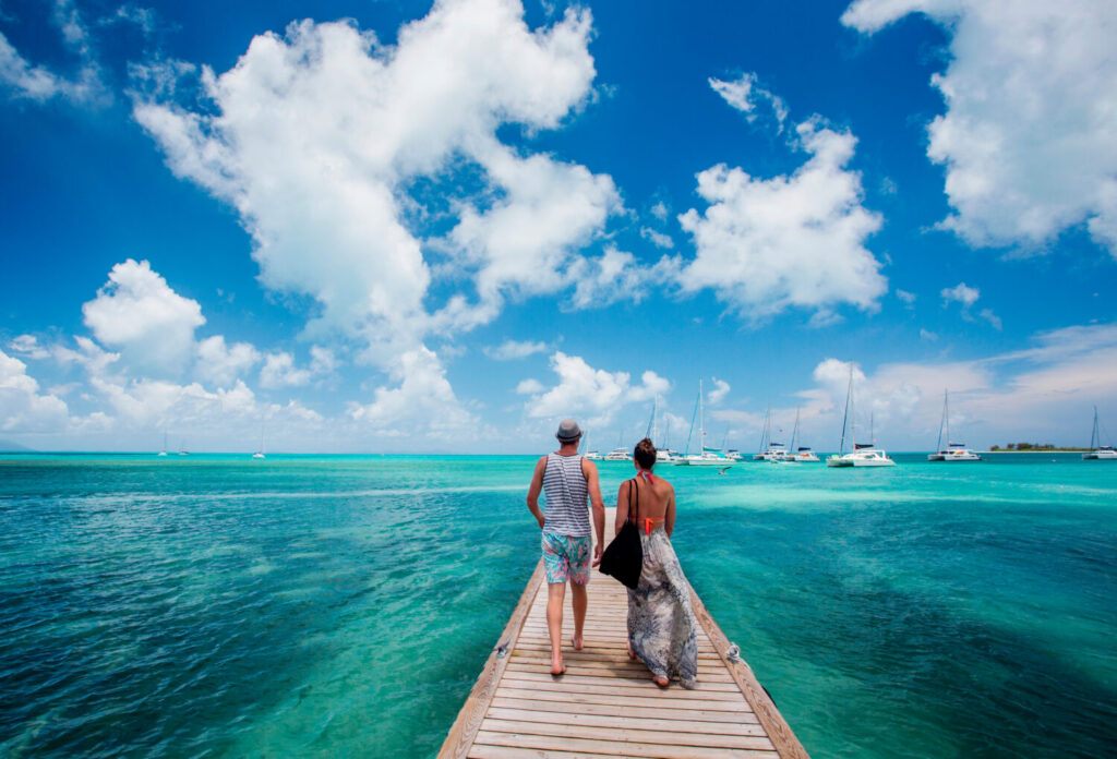 Una pareja camina por un largo muelle rodeado por el mar de las aletas y el cielo azul