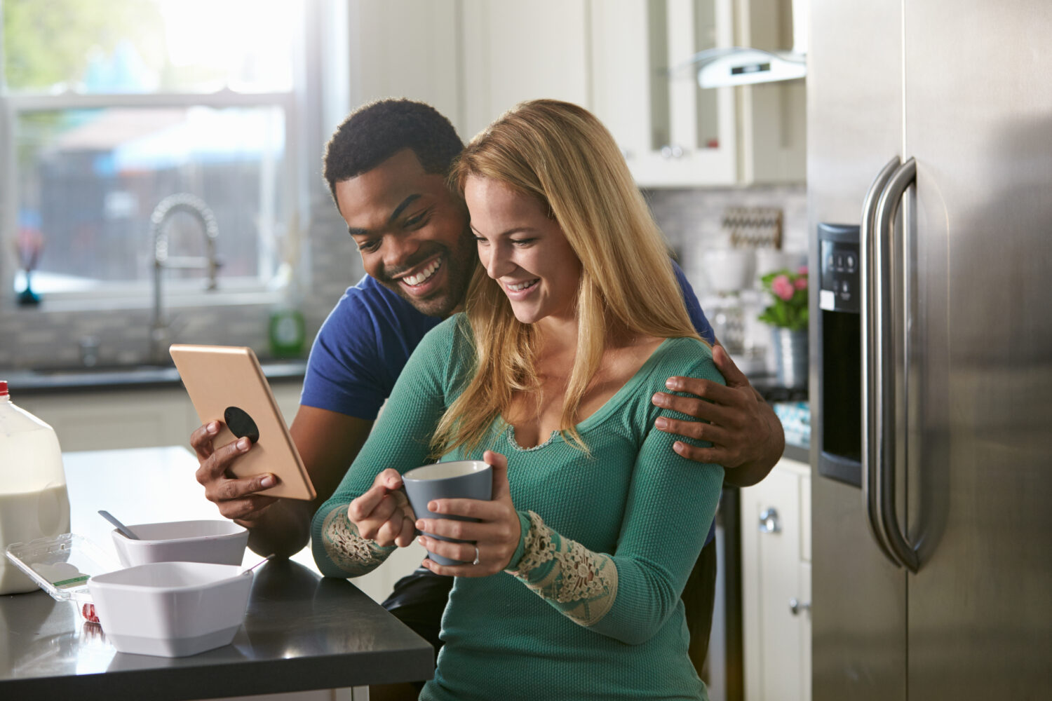 una pareja de razas mixtas mirando juntos una tableta en ID: 89196 Una pareja de razas mixtas mirando juntos una tableta en la cocina