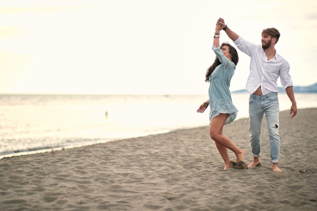 Una pareja romántica feliz está bailando junto al mar en la playa.