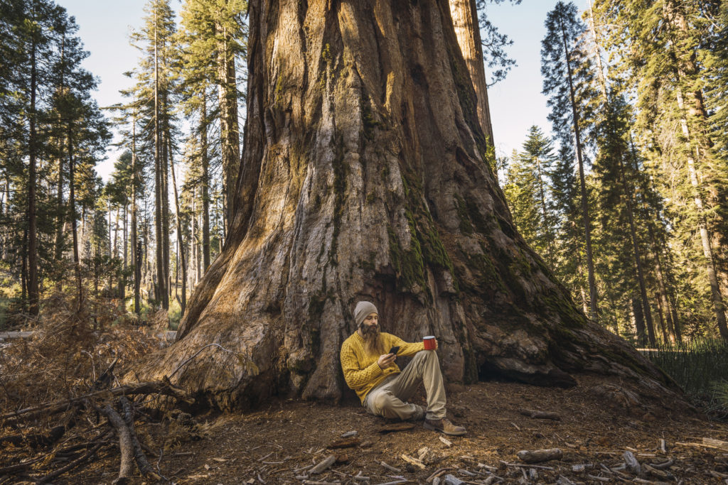 USA, California, Yosemite National Park, Mariposa, man sitting at sequoia tree with cell phone and mug