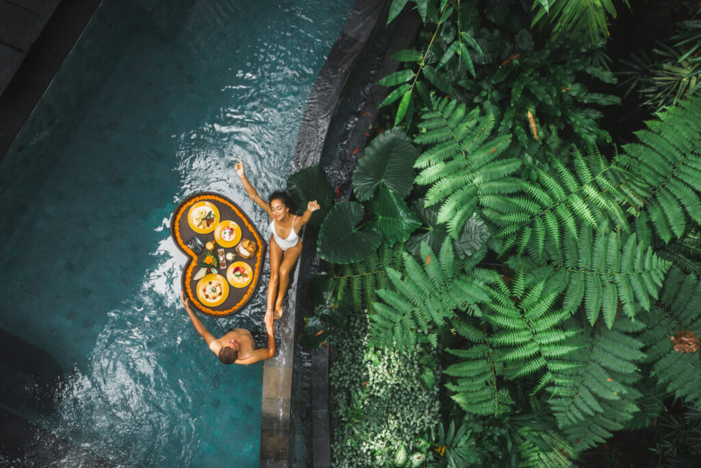 Viaja feliz pareja enamorada comiendo el desayuno flotante en la piscina de la jungla. Despertar por la mañana. Bandeja de mimbre negra en forma de corazón, San Valentín o sorpresa de luna de miel, vista desde arriba.