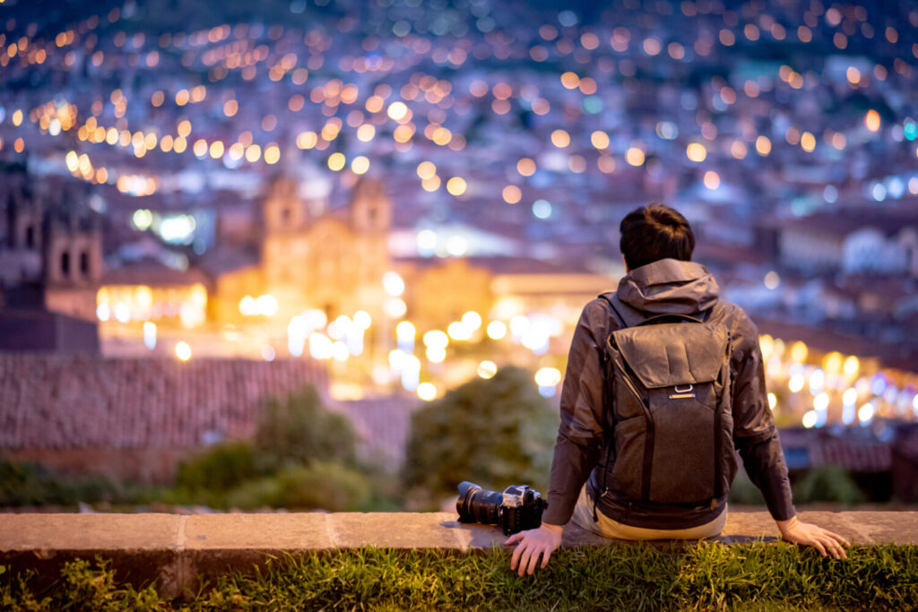 Viajero asiático y fotógrafo sentado en el mirador mirando la iluminada ciudad de Cusco de noche. Cusco es una ciudad al sureste del Perú, cerca del Valle de Urubamba, en la cordillera de los Andes