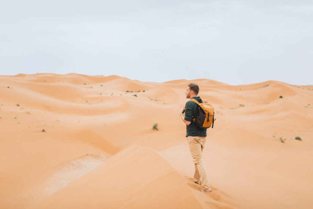 Viajero mochilero en Marruecos, desierto del Sahara. Explore la naturaleza africana, dunas de arena alrededor. Vista desde atrás.