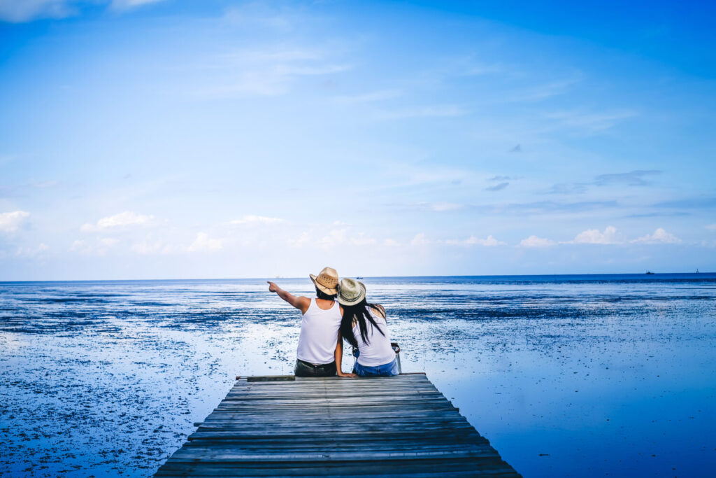 viajero pareja que busca vistas al bosque de manglares y al mar. Turista asiático sentado en el puente hacia el mar de vacaciones.