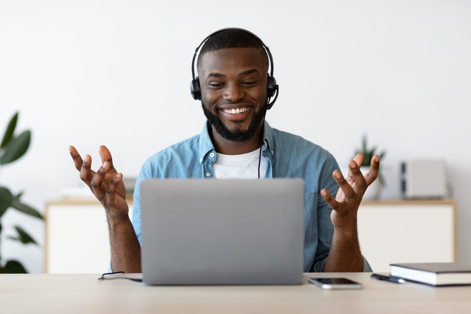 videollamada alegre hombre africano estadounidense en los auriculares al haber conocido
