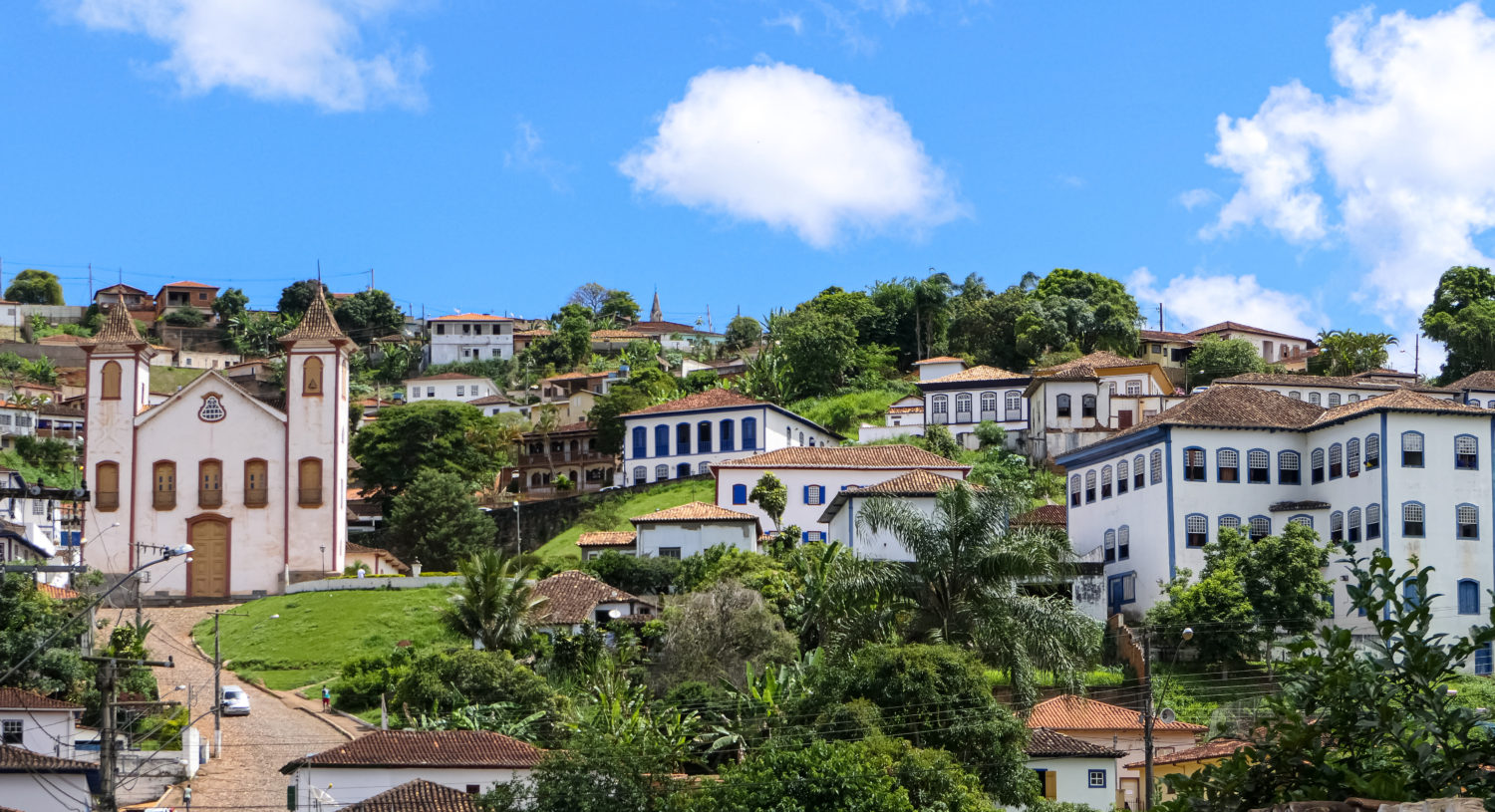 View to historic mining town Serro nestled on a hill, blue sky and white clouds, Minas Gerais, Brazil