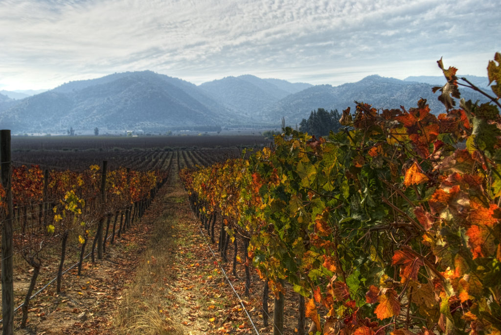 Vineyard in fall in central Chile most leaves have fallen but few left keep strong color, wine Zone in Central Chile, Colchagua Valley.