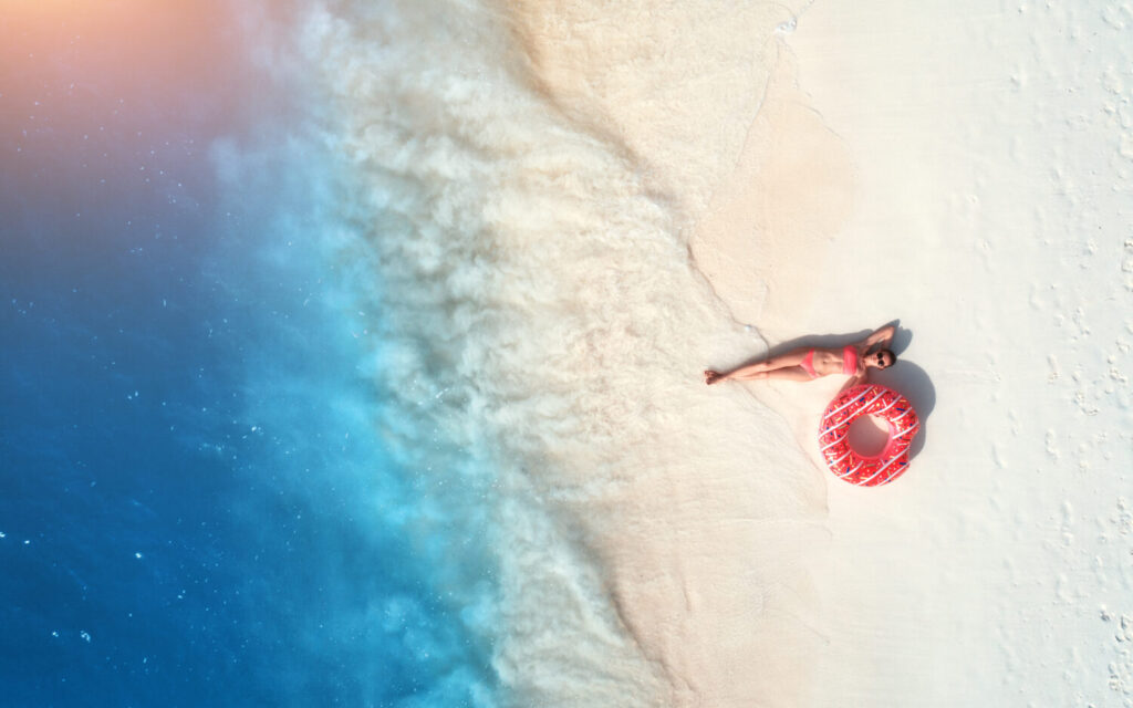 Vista aérea de la bella joven tendida con el anillo de nado rosado en la playa de arena blanca cerca del mar azul con olas al atardecer. Vacaciones de verano. Vista superior de una chica delgada, agua transparente. Océano Índico