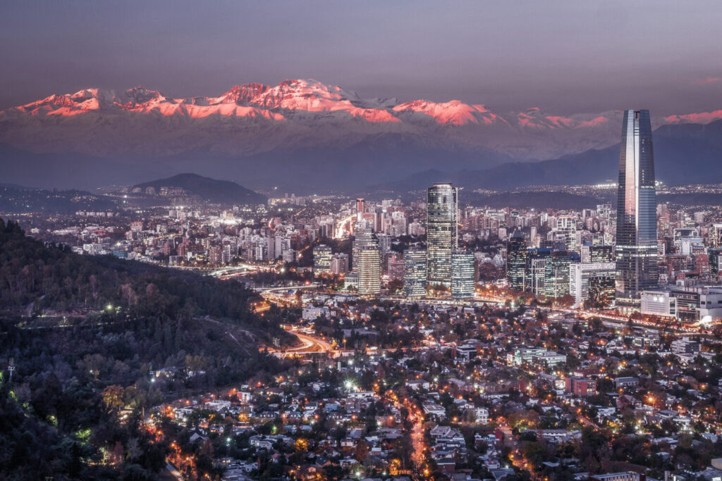 Vista de las montañas de Santiago y Andes al atardecer desde Cerro San Cristóbal, Chile