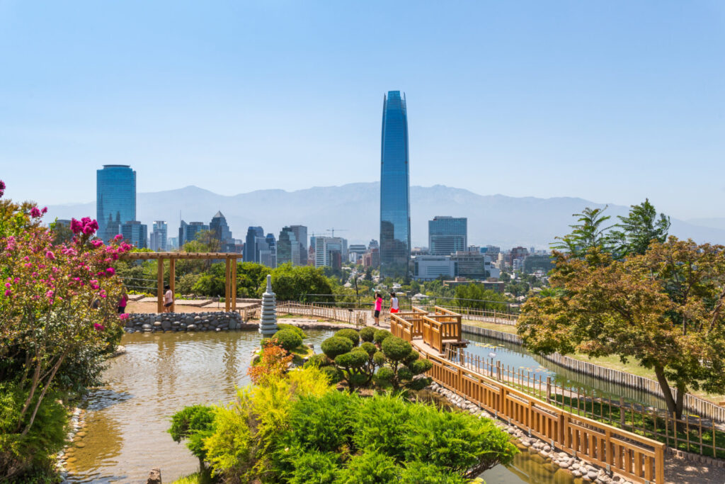 Vista de un Parque Japonés y el horizonte de Santiago de Chile