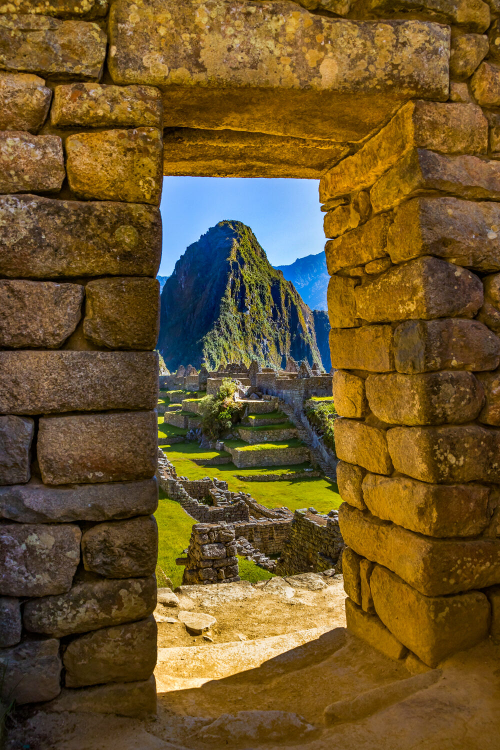 Vista desde una puerta dentro de la ciudad inca de Machu Picchu. Cerca de Cusco, Perú. Patrimonio de la Humanidad de la Unesco, una de las nuevas maravillas del mundo.