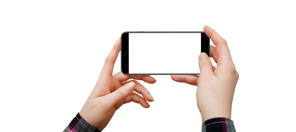 Vista horizontal del smartphone negro moderno. Mujer con dispositivo móvil aislado en fondo blanco.