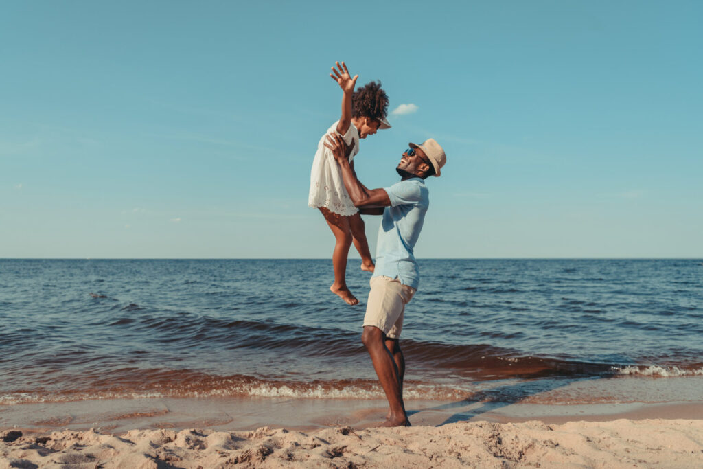 vista lateral del feliz padre afroamericano jugando con una linda hija pequeña en la playa