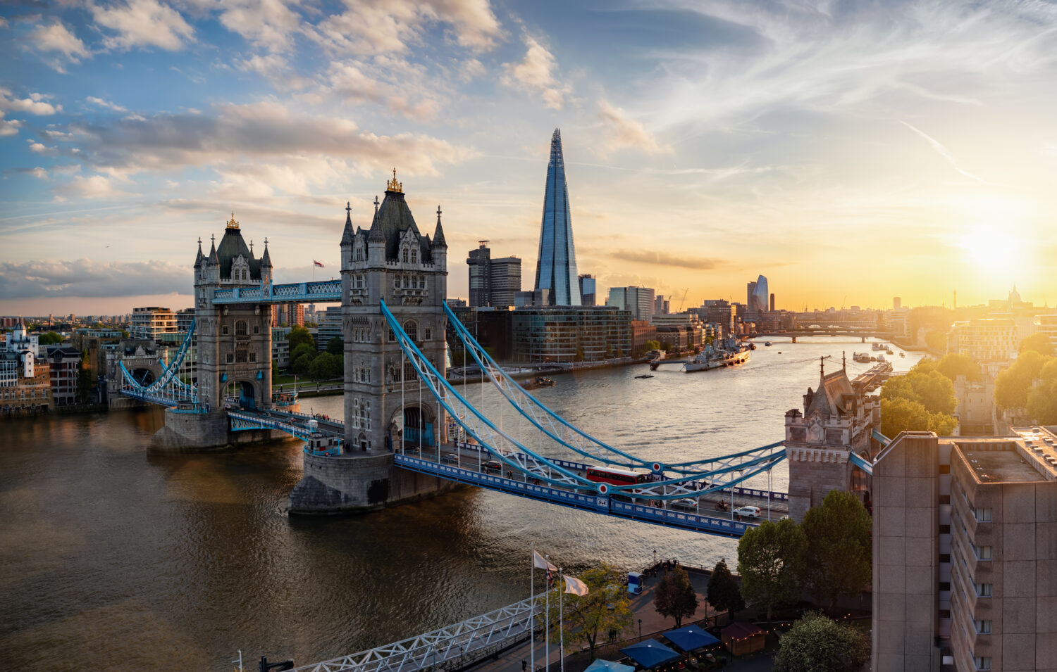 Vista panorámica aérea del icónico Tower Bridge y el horizonte de Londres, Reino Unido, durante el atardecer