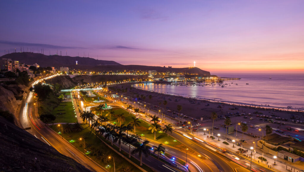 Vista panorámica de la playa de Aguadulce al atardecer, Chorrillos, Lima, Perú.
