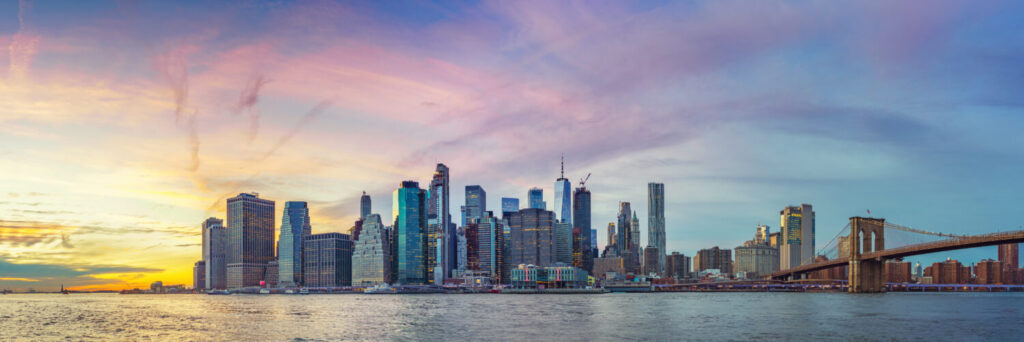 Vista panorámica de Manhattan y del puente de Brooklyn al atardecer, Nueva York